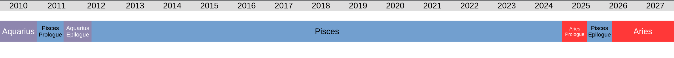 Firstly, the Prologue of Neptune in Pisces was from April 4 through August 4, 2011. During these four months we could expect to find various themes, topics, and story-lines emerge that would prove to be foundational, persistent, and important for the duration of the period. After that time Neptune regressed to the previous sign of Aquarius, only returning to Pisces on February 3, 2012, thereby beginning the core Neptune in Pisces period. On March 30, 2025 Neptune entered the following sign of Aries, returning back to Pisces on October 22, 2025, beginning the Epilogue of Neptune in Pisces. This lasts until January 26, 2026, after which time The Calendar moves on to the Neptune in Aries period, not returning to Pisces again for 150 years.