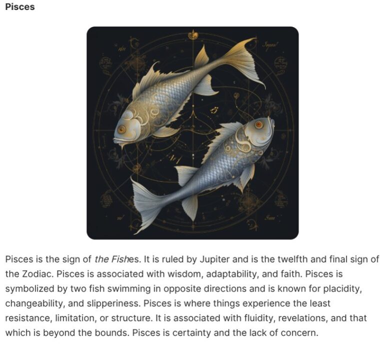 Starting with the territory let’s examine the sign of Pisces. Remember that signs are elemental so Pisces and other signs cannot be described as anything other than what they are. Pisces is not “like” something else it is Pisces. Interpreters of the Calendar already understand these elements well and use many shorthand keywords or tells to refer to and identify them but there are some useful criteria that serve as guidelines worth noting here. To evaluate a sign we can use four base criteria: the element, the ruling planet, the modality, and the polarity. In the case of Pisces these are: water, Jupiter, mutable, and feminine. Each of these criteria provide data about one aspect or another of the sign and combining them allows us to infer specifics about the nature of the sign/element and how to recognize it. Importantly these criteria act as guardrails which ensure compatibility of interpretation between different parties. With that in mind, let’s review what has been previously said here about Pisces: